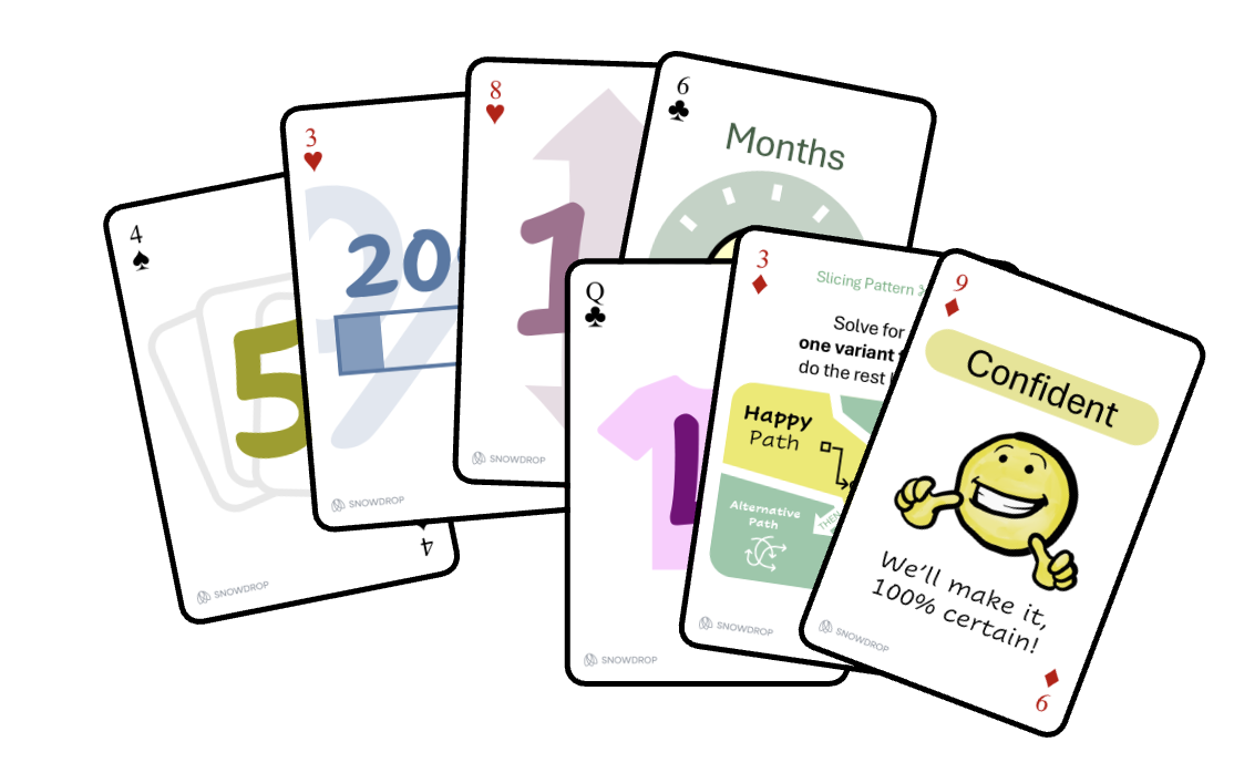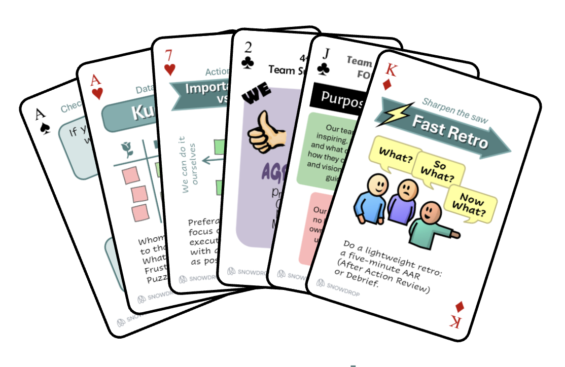 Snowdrop proudly presents playable decks with booster cards for learning, improving and running exercises or drive chage in a fun way. Cards are to be used in meetings and they have different themes. Here you can find additional instructions, tips and trics and instruction vodeos for some of the exercises